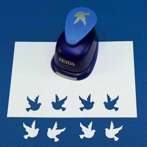 Robuster Hebelstanzer von Heyda mit grossem Taubenmotiv. Durch die asymetrische Form der Tauben kann das Taubenmotiv auf zwei Arten ausgestanzt werden. Die ausgestanzten Taubenteile werden unten am Hebelstanzer ausgegeben. Öffnen oder entfernen Sie dazu das transparente Ausgabefach. Mit einer Schablone und den am Motivstanzer angebrachten Markierungen, kann die Position der Tauben zum ausstanzen genau bestimmt werden. Der maximale Abstand des unteren Teils der Tauben zum Rand von Karten beträgt 8 mm. Zum schärfen des Hebelstanzers am besten einige Teile aus dünner Alufolie ausstanzen. Mit dem Heyda Hebel Motivstanzer grosse Taubenformen selber herstellen.