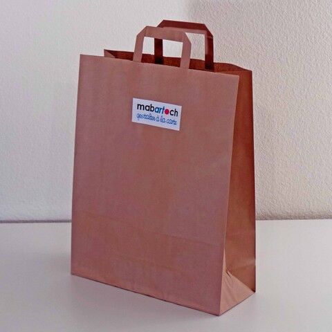 Braune Papiertragtasche ohne Aufdruck zum selber gestalten. Die Tragtasche kann zum Beispiel mit Kinder Zeichnungen bemalt, mit einem Spruch beschriftet oder mit individuell gestalteten Etiketten beklebt werden. Schnell und einfach eine individuell gestaltete Tragtasche für ein Mitbringsel gestalten.