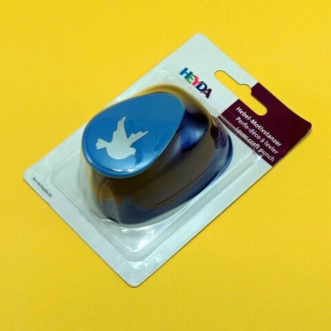 Robuster Hebelstanzer von Heyda mit grossem Taubenmotiv. Durch die asymetrische Form der Tauben kann das Taubenmotiv auf zwei Arten ausgestanzt werden. Die ausgestanzten Taubenteile werden unten am Hebelstanzer ausgegeben. Öffnen oder entfernen Sie dazu das transparente Ausgabefach. Mit einer Schablone und den am Motivstanzer angebrachten Markierungen, kann die Position der Tauben zum ausstanzen genau bestimmt werden. Der maximale Abstand des unteren Teils der Tauben zum Rand von Karten beträgt 8 mm. Zum schärfen des Hebelstanzers am besten einige Teile aus dünner Alufolie ausstanzen. Mit dem Heyda Hebel Motivstanzer grosse Taubenformen selber herstellen.